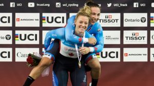 Kanadyjki Kelsey Mitchell i Lauriane Genest po zdobyciu złota w piątek