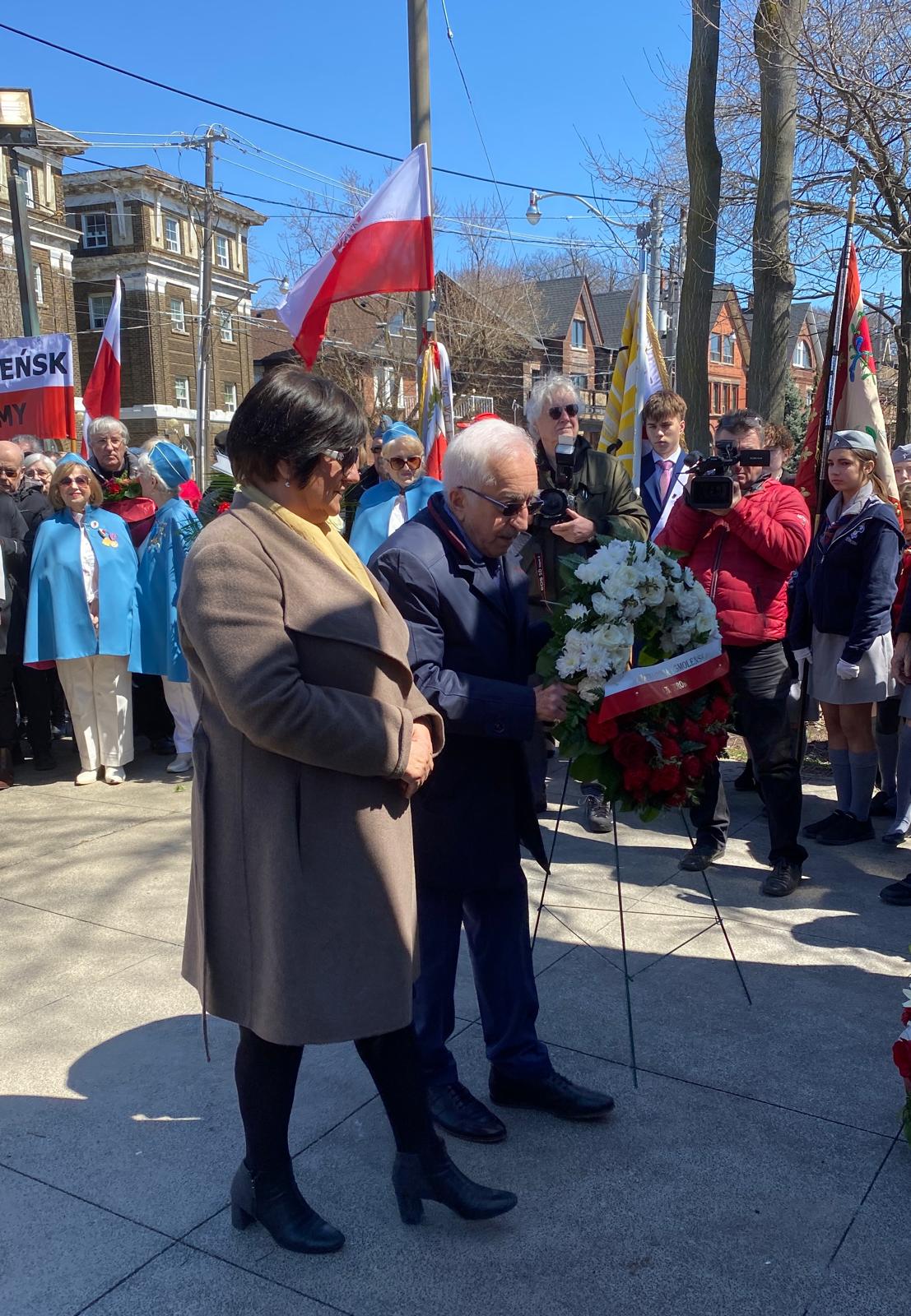 Po wspólnym odśpiewaniu hymnów Polski i Kanady prowadzący uroczystość prezes J. Cytowski przedstawił gości honorowych, wymieniając konsula Marka Ciesleczuka, prezesa Koła Byłych Żołnierzy AK weterana Stanisława Woźniaka, prezesa KPK Dominika Roszaka, kandydatów do władz federalnych z rejonu High Park Władysława Lizonia i Karima Bardeesy-ego, młodzież ze szkoły im. Gen. Hallera z dyrektor Sylwią Krupą oraz p. Lucjana Conrada, który był przewodniczącym Komitetu Budowy Pomnika Katyńskiego w Toronto, odsłoniętego w 1980 r. Przedstawiając p. Conrada, prezes J. Cytowski omówił krótką historię powstania koncepcji budowy pomnika oraz kontrowersji i trudności szczególnie ze strony ambasady sowieckiej i polskiej w tym czasie.