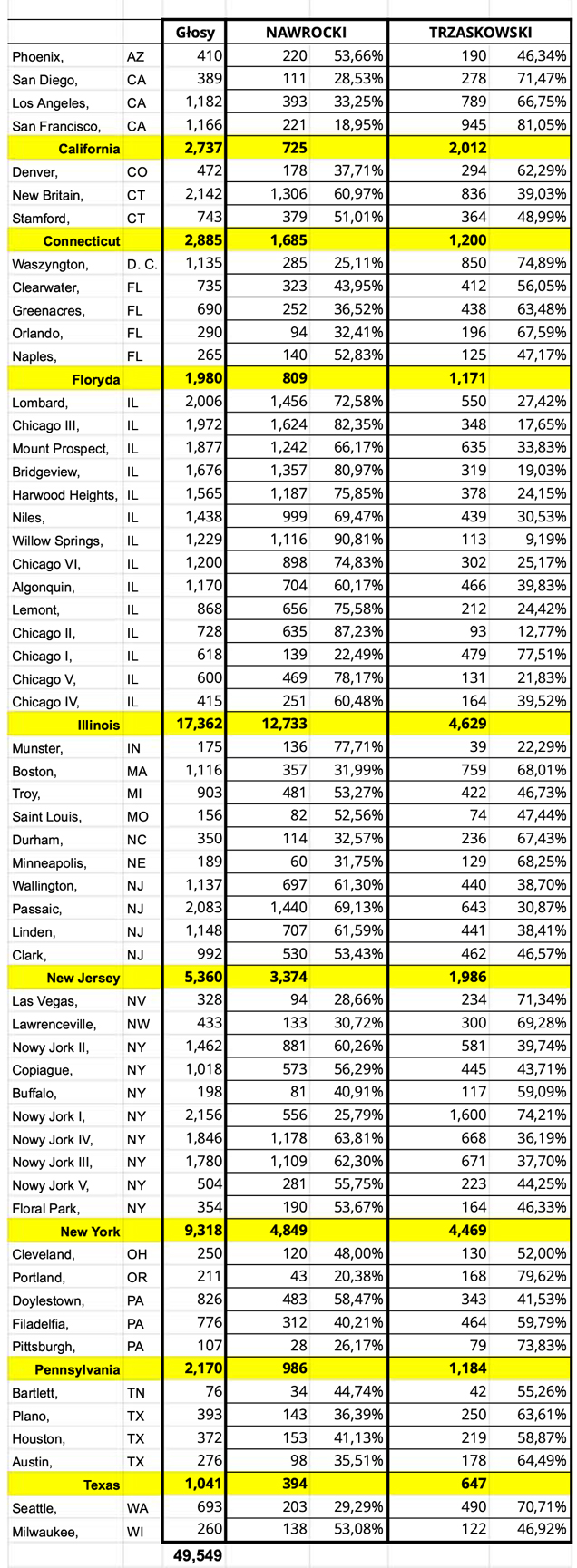 W USA w wyborach prezydenckich w Polsce zwyciężył Karol Nawrocki zdobywając 56,65% głosów.  We wszystkich okręgach wyborczych w USA oddano  49 549 ważnych głosów.