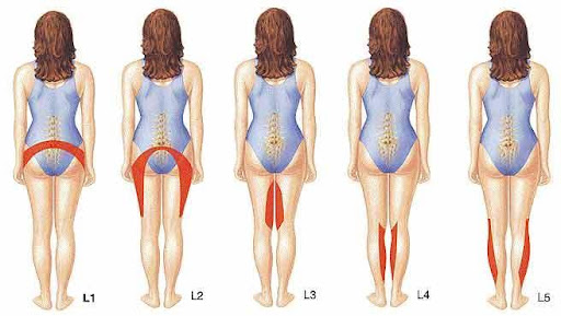 Ilustracja przedstawia strefy promieniowanie bólu przy wypadniętym dysku ( zaznaczone na czerwono). L1 oznacza 1-szy krąg lędźwiowy, a L5 ostatni krąg lędźwiowy. Widzimy jak ból przesuwa się do dołu, im niżej położony jest dysk, ponieważ uciska niżej umiejscowione nerwy rdzeniowe