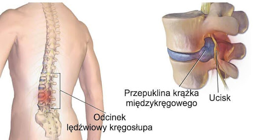 Najczęściej jest to przeszywający paraliżujący ból pleców promieniujący do pośladka lub nogi, któremu towarzyszy drętwienie kończyny dolnej, gdy uszkodzony dysk jest w okolicy lędźwiowej.