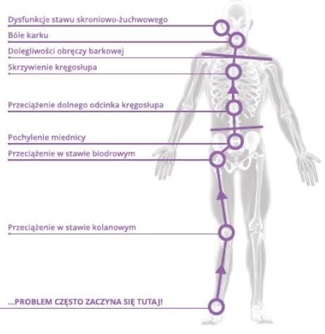 Ilustracja pokazuje, ze płaskostopiu towarzyszy dodatkowo koślawość kolan i koślawość tyłu stopy – kolana i stopy skracają się do środka. Płaskostopie powoduje ból podeszwy stopy. Dokucza on szczególnie w trakcie chodzenia, a ponieważ boli, to chcąc ten ból złagodzić, zaczynamy nieprawidłowo chodzić. Po prostu znajdujemy taką pozycję ułożenia stopy, która w największym stopniu pomaga nam zniwelować odczuwalny ból. Zmieniając mechanikę chodu, przeciążamy staw kolanowy i biodrowy, a późniejszym czasie kręgosłup, co prowadzi do nieprawidłowej postawy ciała. Co powinniśmy zrobić? Chiropraktor, na podstawie odcisku stopy i sprawdzeniu ergonomii chodu oraz biomechaniki stopy dobierze odpowiednią wkładkę ortopedyczną, która zabezpieczy prawidłowe ustawienie stopy, co pomoże zniwelować powyższe przeciążenia i zmniejszy ból.