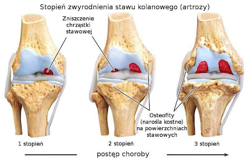 Ilustracja przedstawia stopniowy proces zużywania się tkanki chrzęstnej w stawie kolanowym. Staje się ona coraz cieńsza, a późnej fazie ulega niemal całkowitemu wytarciu (faza 3-ta). W fazie 1 i 2-giej fizjoterapia może pomóc. W 3-ciej jedynie leczenie chirurgiczne jest skuteczne, ponieważ powstają duże narośla kostne ograniczające ruch oraz ponad 60% chrząstki jest zniszczone, co powoduje stały ból kolana.