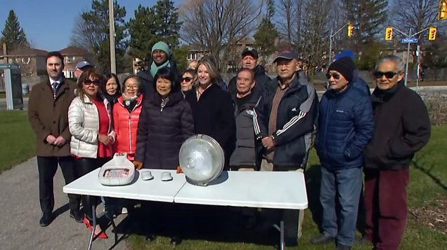 Burmistrz Olivia Chow i dyrektor generalna Toronto Hydro Jana Mosley (w środku) wraz z innymi urzędnikami miejskimi i mieszkańcami obszaru parku Milliken pozują do zdjęcia podczas ogłaszania planów infrastrukturalnych 8 kwietnia 2026 r.