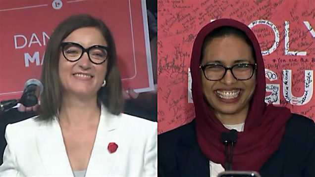 Danielle Martin (po lewej) i Doly Begum z partii liberalnej rozmawiają ze swoimi zwolennikami po wygraniu dwóch okręgów wyborczych w poniedziałkowych wyborach uzupełniających w Toronto, co dało Liberałom federalnym większość w parlamencie.